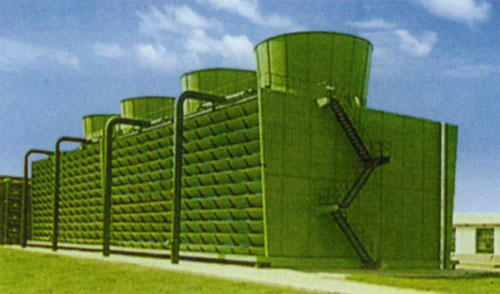 本塔采用兩側進風,靠頂部的風機,使空氣經由塔兩側的填料,與熱水進行介質交換,濕熱空氣再排向塔外。填料采用兩面有凸點的點波片,通過安裝使點片粘結成整體,以提高剛性,由于兩面有凸點,避免了水滴直接滴下的機會,提高了形成水膜的作用,填料尾部設有收水措施。